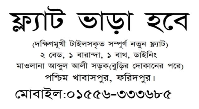 মাওলানা আব্দুল আলী সড়ক পশ্চিম খাবাসপুর, ফরিদপুর পৌরসভাভাড়াঃ ৬০০০৳/মাস